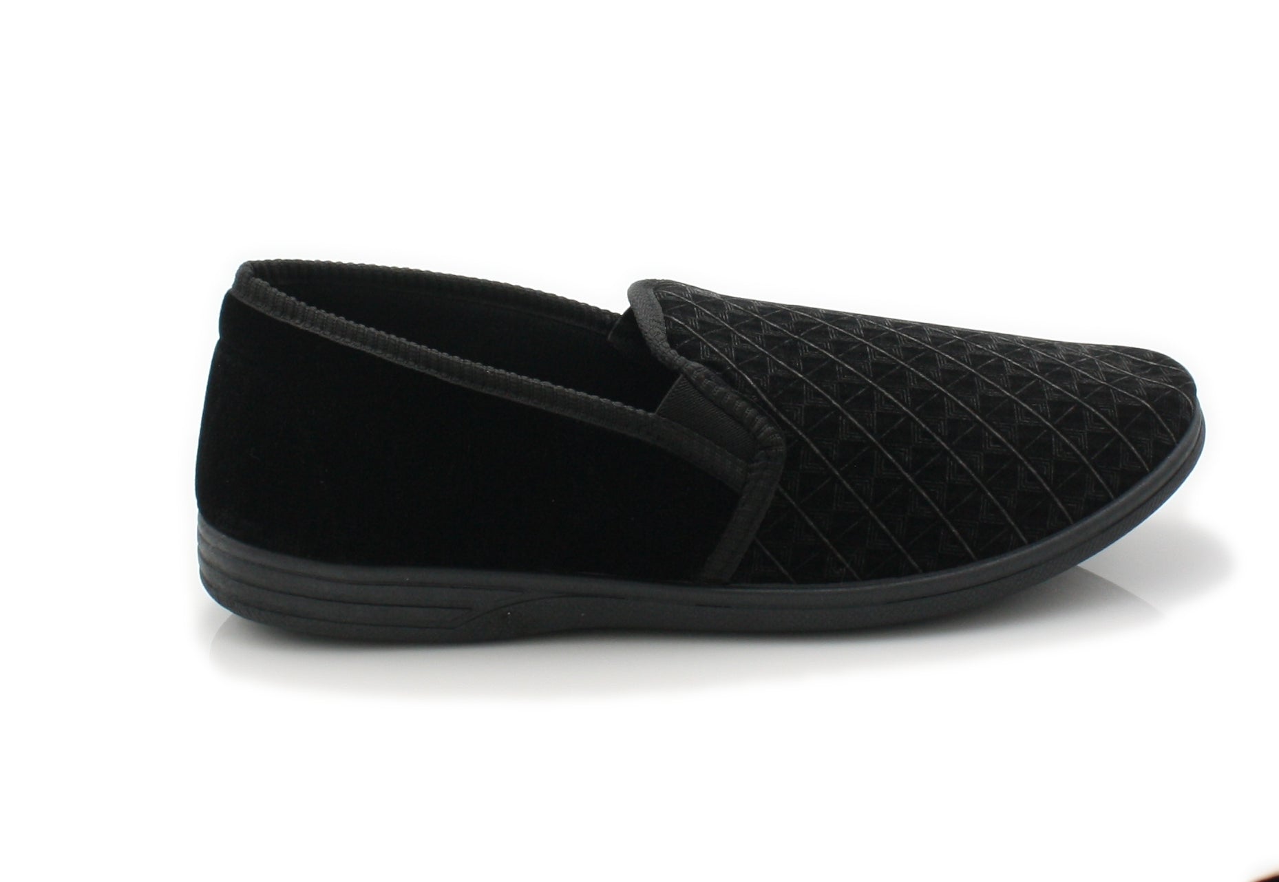 Velour Textile uppers, Self coloured Patterned front, plain sides & back. cushioned inners, durable synthetic rubber sole,