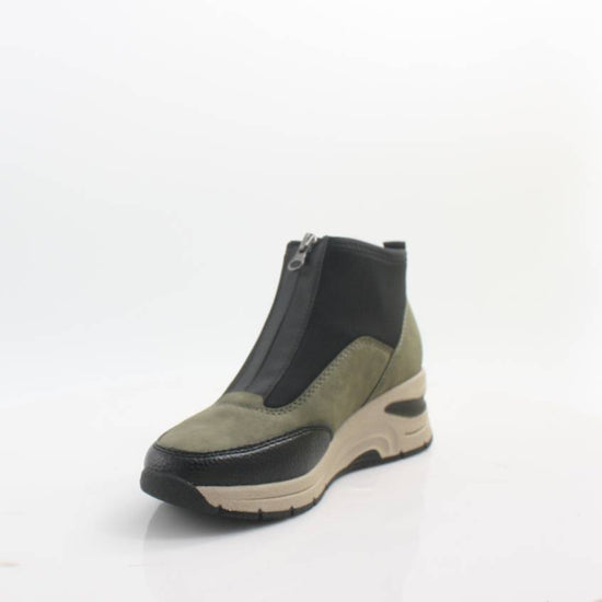 These RIEKER ankle boots have a modern style thanks to their color combination of black and green, as well as an interesting combination of upper materials. The zip located on the instep simplifies putting on the shoes and you slip into a pleasantly soft removable insole that adapts to the shape of the foot. The sole adds a contrasting fashion element thanks to its color and higher design, in addition to providing stability when walking and shock absorption when walking thanks to Antistress technology. This shoe model is an ideal choice for women looking for a combination of trend and comfort.